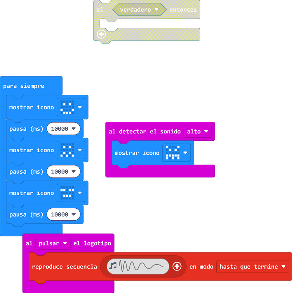 Para dar más posibilidades a tu robot… Puedes programar la placa micro:bit para que vaya cambiando la animación de la pantalla cada 10 segundos o según el ruido ambiental del entorno.